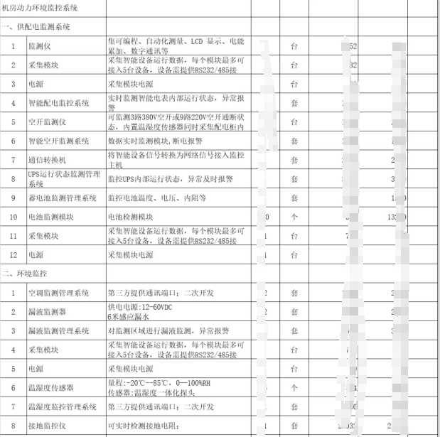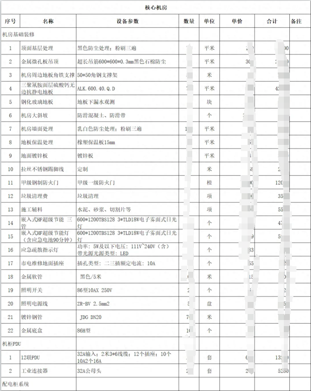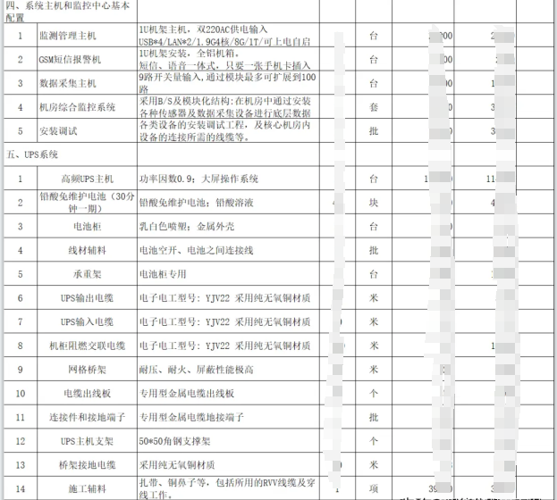 機(jī)房建設(shè)是一個(gè)綜合性的工程,?涉及到多個(gè)系統(tǒng)的設(shè)計(jì)和安裝,?包括配電系統(tǒng)、?照明系統(tǒng)、?防雷接地系統(tǒng)、?空調(diào)通風(fēng)系統(tǒng)、?安全監(jiān)控系統(tǒng)等。?以下是一個(gè)機(jī)房建設(shè)的清單明細(xì)表,?詳細(xì)列出了機(jī)房建設(shè)清單所需的主要設(shè)備和材料:?